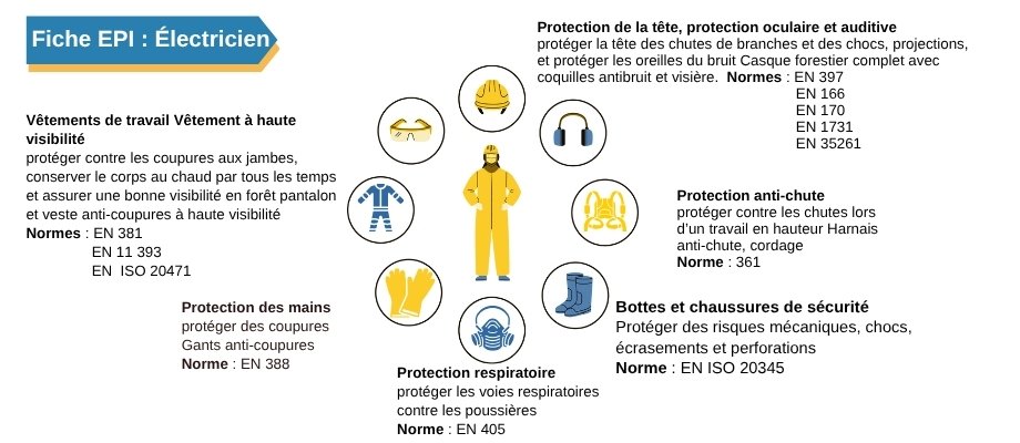 Ces équipements comprennent une tenue de travail adaptée, des chaussures de sécurité, un écran facial et des gants isolants, conformément aux exigences de prévention liées aux interventions électriques.